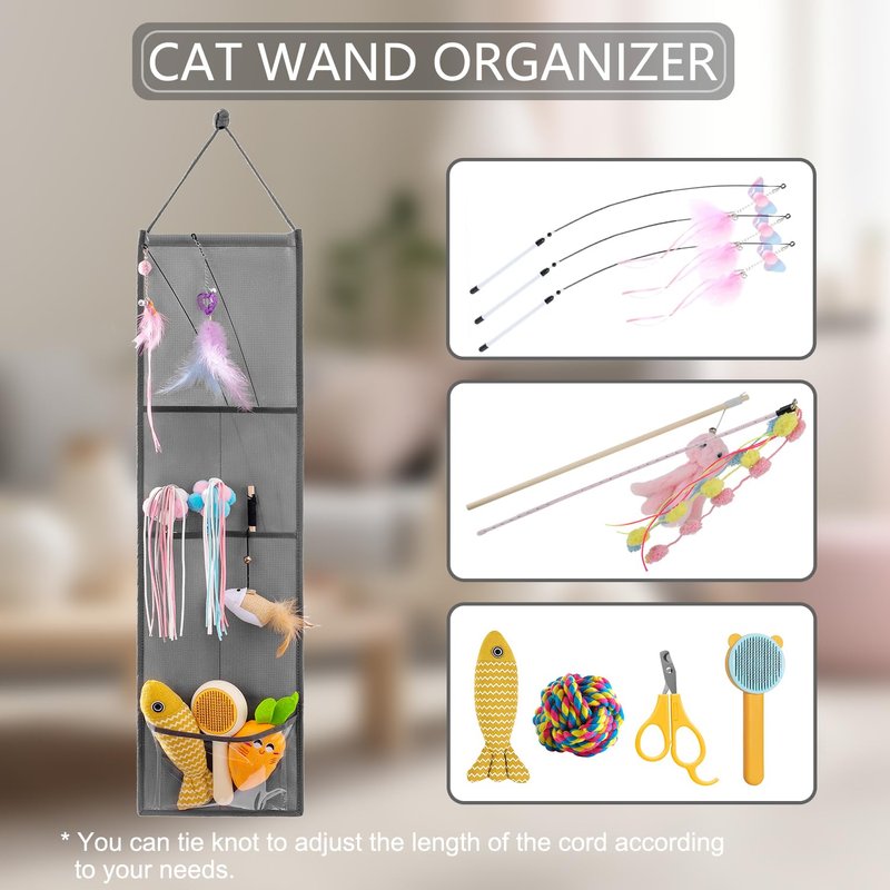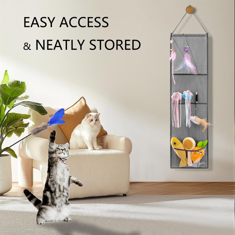 - Hanging pet storage organizer is the perfect way to centralized display cat wand and little toys, convenient to quickly see and pick the kitten toys what you placed when you want to play with your cats. This cat room accessories holder is lightweight and folded, which is easy to carry and store.