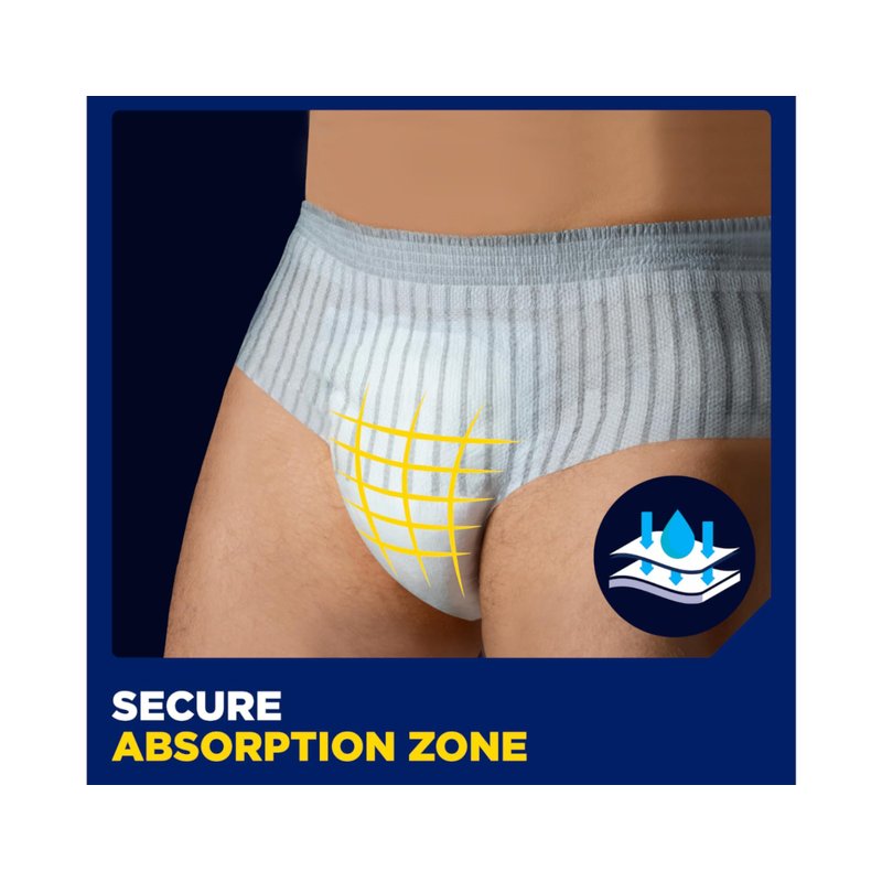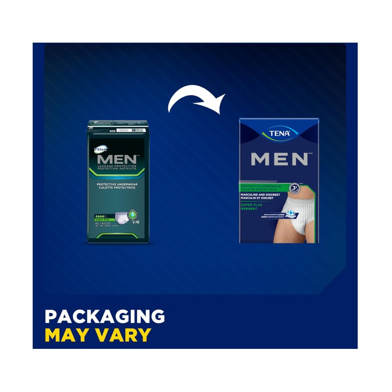 TENA Men Super Plus Underwear fits close to the body and is designed to look and feel like regular underwear. Featuring elastic threads for a fit that stays in place, this underwear can be easily pulled on and off, and has tear-away sides for efficient removal. The core helps effectively move liquid away from the skin for added comfort with Super Plus absorbency for moderate to heavy bladder leakage protection. Designed to look and feel like regular underwear. Triple Protection; Super absorbent core.