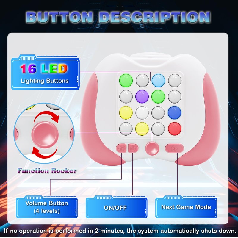 - Safe Material : - Made of high-quality ABS with rounded corners, the pop game is not easy to break and safe for children. If no operation is performed in 2 minutes, the system automatically shuts down.