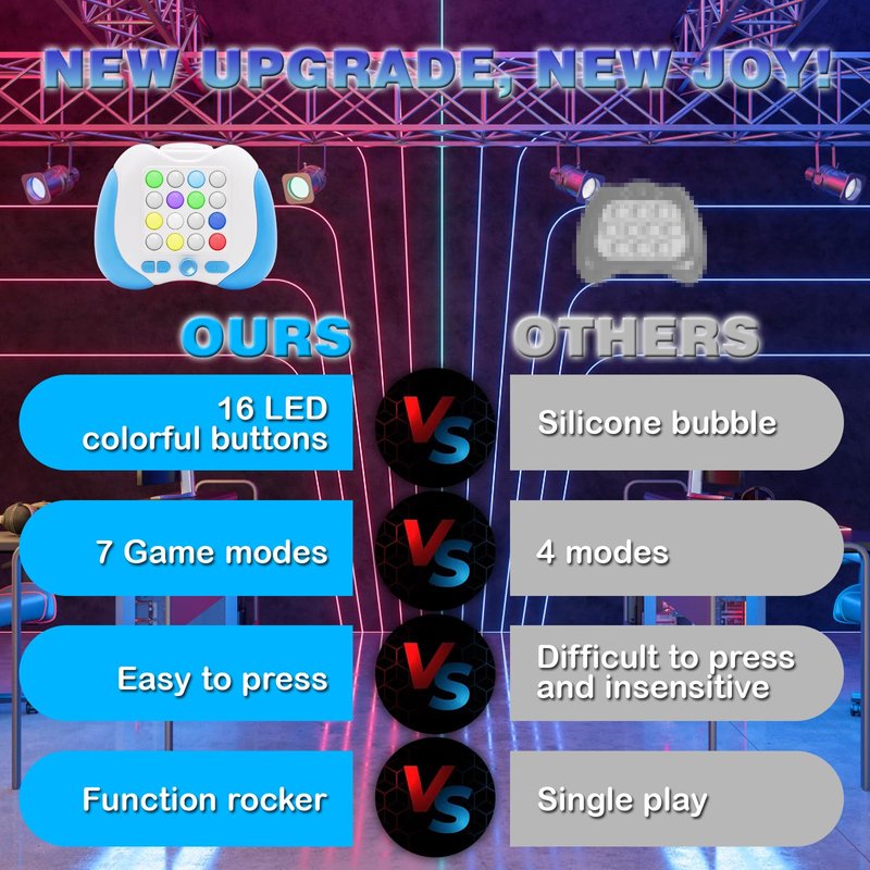 - Newest Light Battle Game : - Newly upgraded quick push lighting battle game machine, 16 LED silicone lighting buttons with 7 game modes and 999+ levels. Soft eye protection without flicker, dark light environment can also play!
