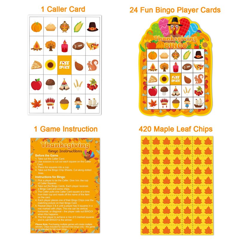 - PACKAGE INCLUDES. 24 Players Thanksgiving Bingo Cards with 420 Player Chips, 1 Calling Card and 1 Game Instruction Cards.