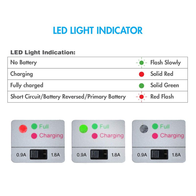 - Fast charge - Quickly recharge battery packs within 1-2 hours with selectable current 0.9A or 1.8A.
