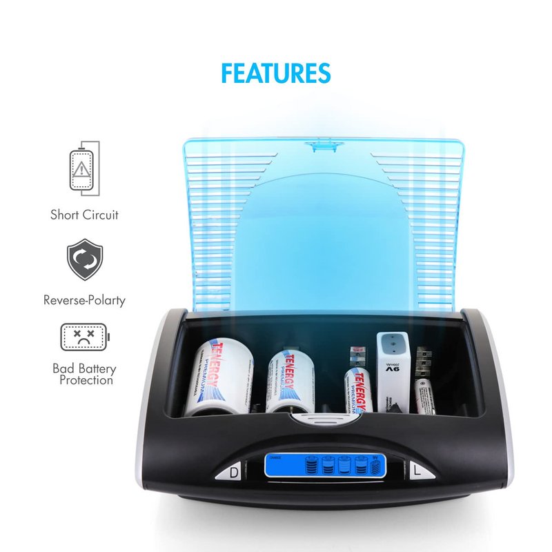 Tenergy T9688 Super Universal LCD Battery Charger with 8 pieces of Premium NiMH Tenergy D Size Rechargeable Batteries - UL Certified