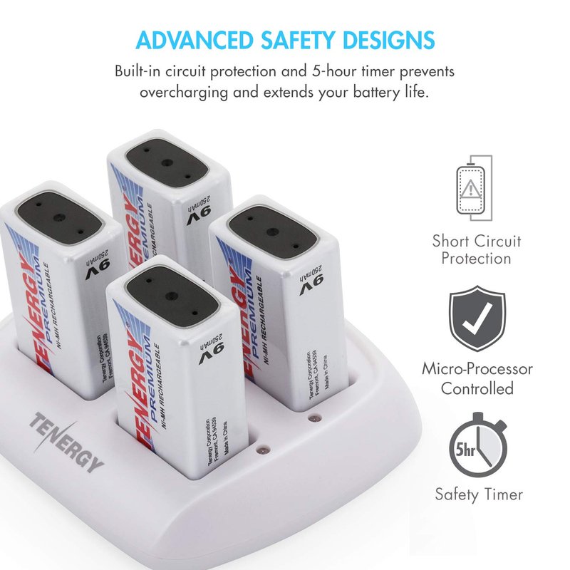 Tenergy TN136 4 Bay 9V Smart Charger with 4 Pieces Tenergy Premium 9V NiMH Rechargeable Batteries