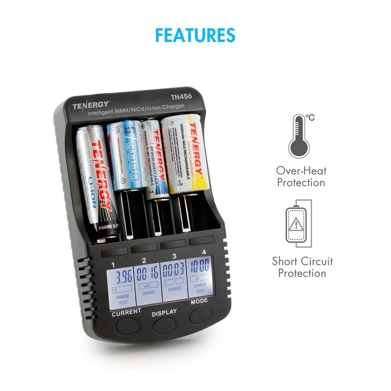 - All in one charger - The Tenergy TN456 universal battery charger works with different sized cells of NiMH, NiCd or Li-ion. Charge any of these NiMH/NiCd sizes- AA, AAA, A, Sub C, C along with Lithium-ion (Li-ion) sizes- 26650, 22650, 18650, 18490, 18500, 17670, 17500, 17335, 16340 (123A), 14500 (AA), 10440 (AAA).