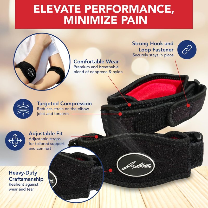 - ALL-DAY COMFORT & DURABILITY: Made from a premium blend of neoprene and nylon, our tennis elbow brace for men & women is durable and lightweight. Enjoy optimum tennis elbow support with our one-size-fits-all design & adjustable elbow straps.