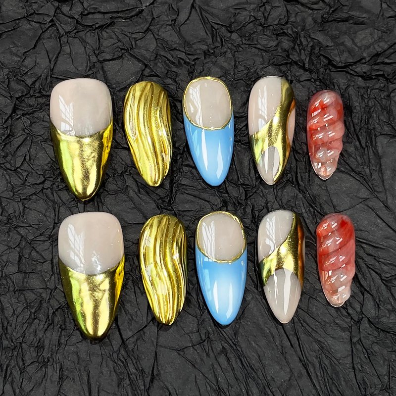 TENPAL Metallic Press on Nails Almond Nails Press ons Full Cover Golden Fake Nails With Glue Handmade Acrylic False Nails With Sweet Cool Y2k 3D Waves Designs 10pcs/Box Stick on Nails For Women(S)