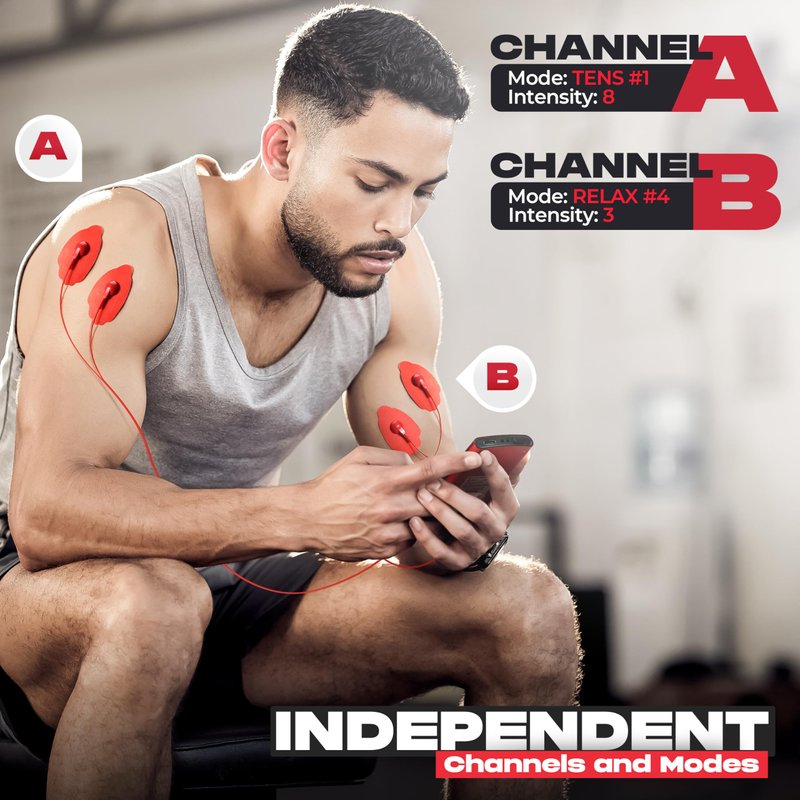 EMS MUSCLE STIMULATOR: 2 independent channels with 24 modes, 20 intensity levels and time control for top relaxation and pain management. You can use 4 electrode pads at the same time. Most effective way to muscle recovery and back pain relief.