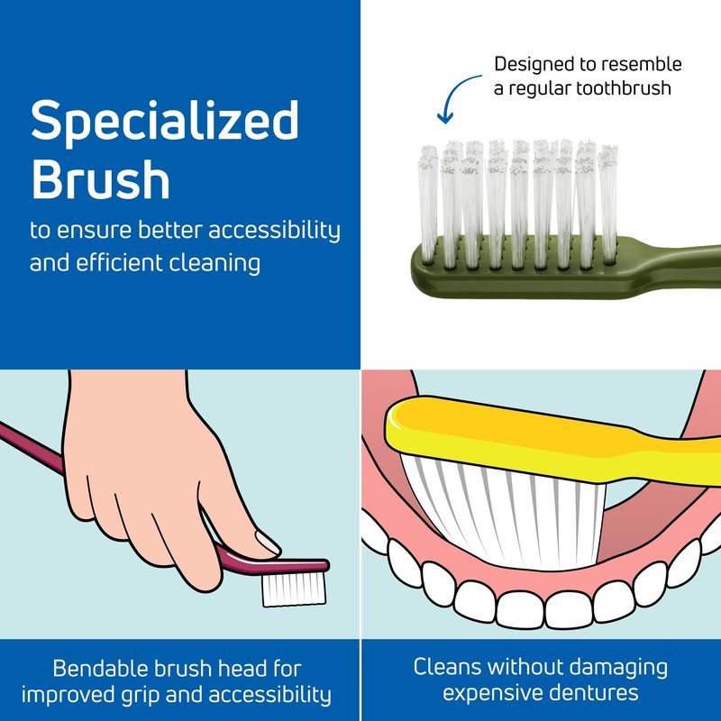 - FIRM-BRISTLE BRUSH FOR DENTURES: Denture Care uses extralong, strong bristles to ensure efficient cleaning without causing damage to the removable denture. Use it with a nonabrasive denture cleanser or neutral soap instead of toothpaste.