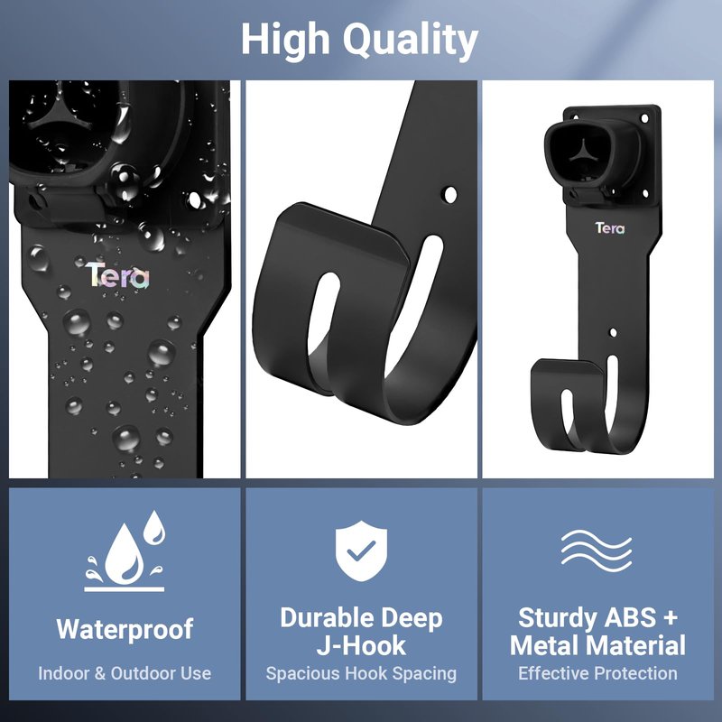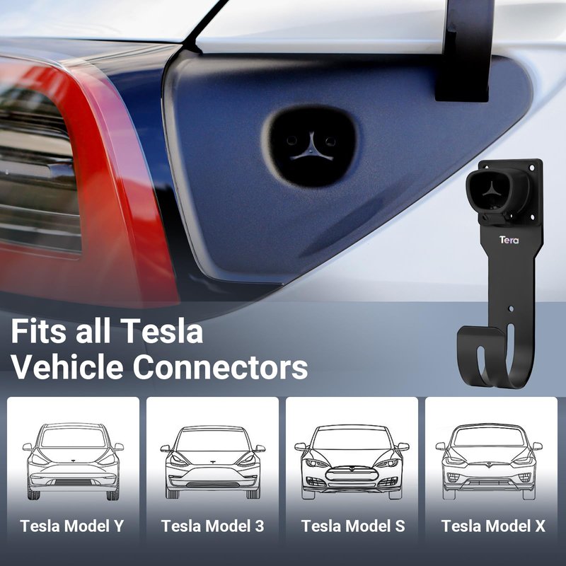 - 【Compatible with All Tesla Model】Tera wall mount connector holder with J-hook works great for Tesla Model S, 3, X and Y. By suspending the cables on the J-Hook, not only can the cables be safeguarded from bending and twisting damages, but it also extends the lifespan of the cables, enhancing the durability and reliability of your charging equipment.