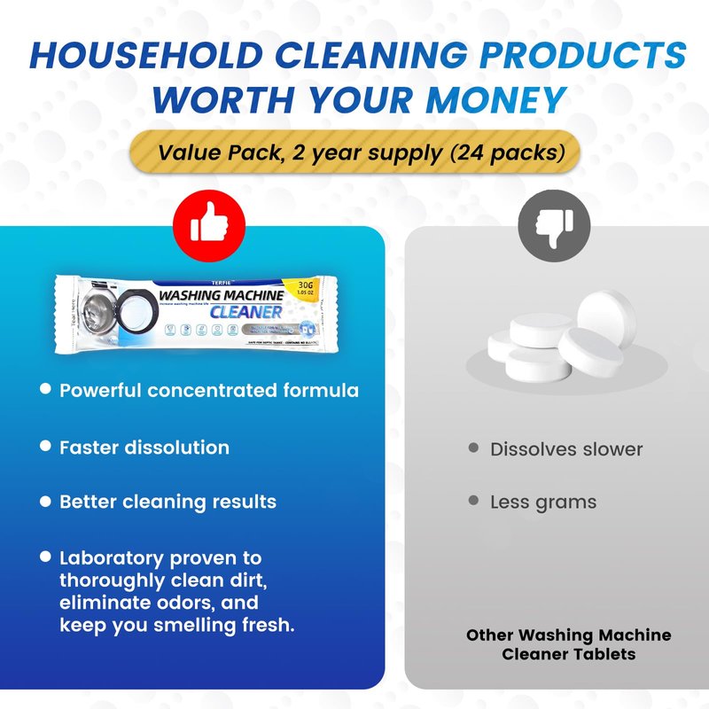 - DEEP CLEANING: TERFIE Washer Cleaner is a powder with surface-active ingredients that quickly penetrates and breaks down dirt, pet hair, and hard water to clean residue from washing machine drums, rubber gaskets, valves, and agitators faster than washing machine detergent tablets.
