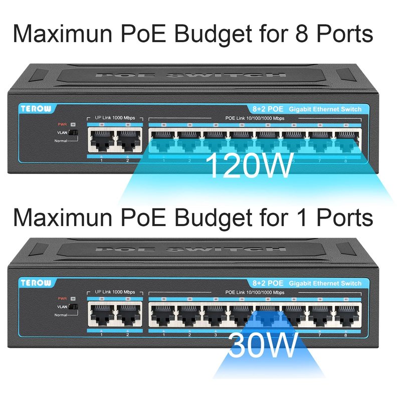 - Ultra-Fast Gigabit Ethernet Switch: Enhance your internet speed with Terow's Gigabit PoE Switch, equipped with 8 Gigabit RJ45 Ports and 2 Uplink Ports. Experience a seamless connection with speeds up to 1,000Mbps