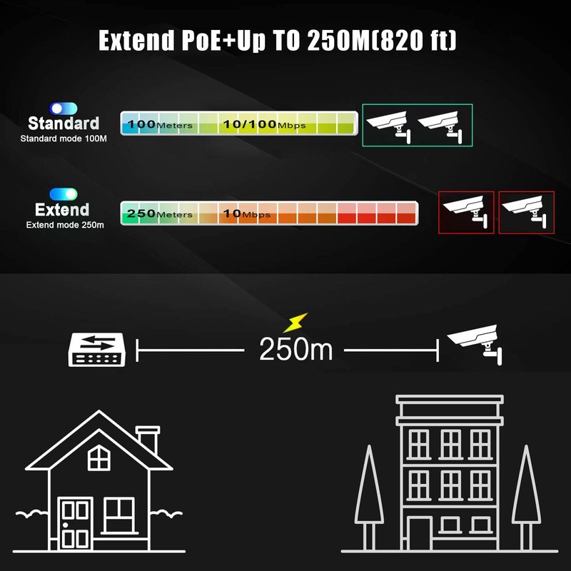 - Smart and Safe PoE Switch: This switch operates within a 110V-240V power range and safely outputs the appropriate voltage (54V for PoE+ devices, 48V for PoE devices, 0V for non-PoE devices) after PD detection. In case of overload, the switch intelligently turns off the highest power ports to ensure the usage of other ports.