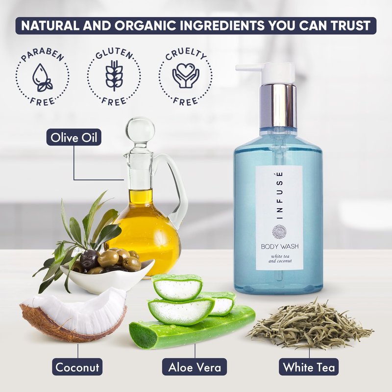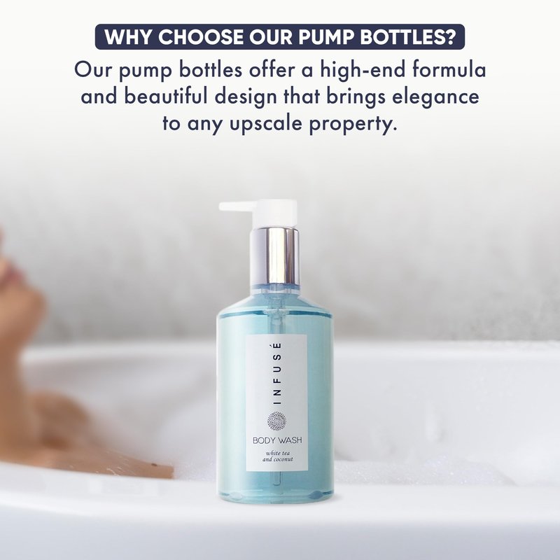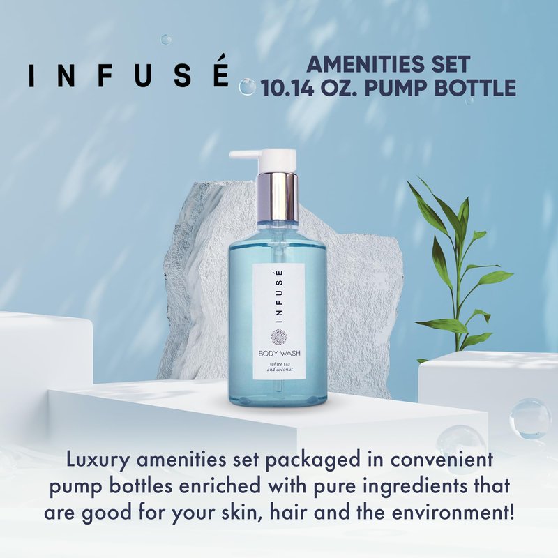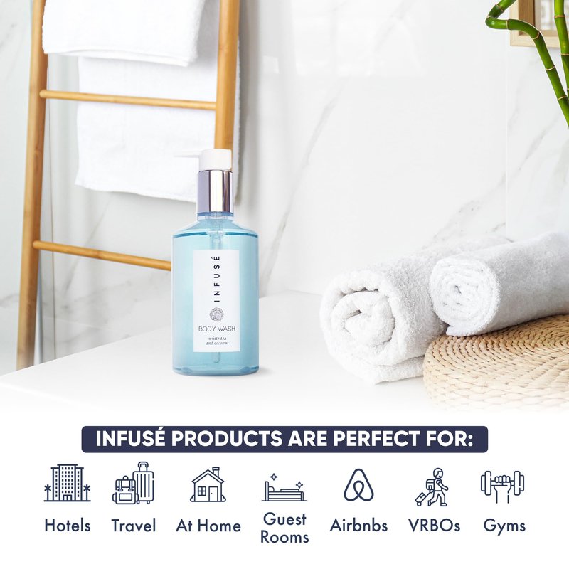 - MINIMAL WASTE, MAXIMUM EFFICIENCY: Infuse Body Wash is designed with vacation rental owners and Airbnb hosts in mind. Unlike classic travel size bottles of bathroom body wash that contribute to waste, our compact body wash allows you to minimize your ecological footprint. Additionally, we offer gallon size bottles of our products, ensuring a seamless refill process for our convenieant 10.14oz pump bottles.