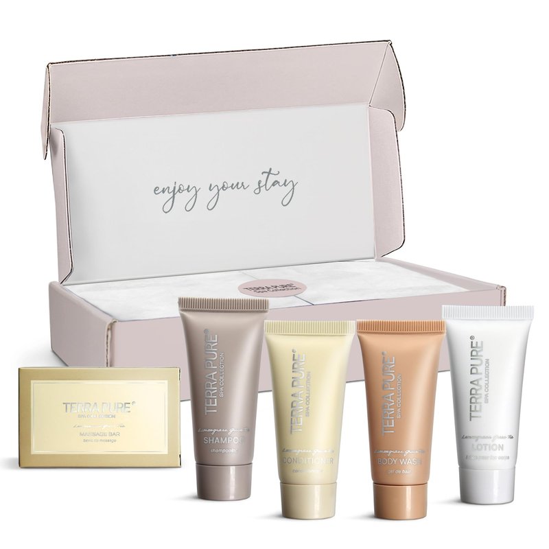 - WHY CHOOSE TERRA PURE SPA COLLECTION? Our high-end formula & environmentally friendly beautiful design bring elegance to any upscale rental or vacation property. Our travel size, pump, and gallon toiletries are paraben-free, gluten-free & made with green tea lemongrass for soft skin & hair! We offer a range of products and cater to all your on-the-go personal care needs.