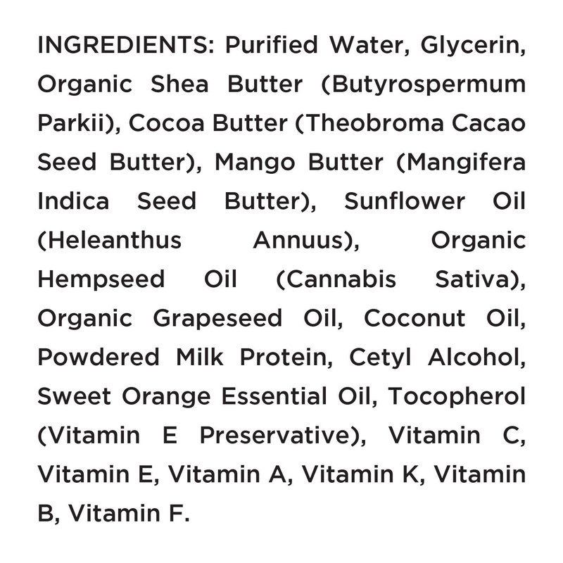 - 100% ALL ORGANIC INGREDIENTS. Purified Water, Glycerin, Organic Shea Butter (Butyrospermum Parkii), Cocoa Butter (Theobroma Cacao Seed Butter), Mango Butter (Mangifera Indica Seed Butter), Sunflower Oil (Heleanthus Annuus), Organic Hempseed Oil (Cannabis Sativa), Organic Grapeseed Oil, Coconut Oil, Powdered Milk Protein, Cetyl Alcohol, Sweet Orange Essential Oil, Tocopherol (Vitamin E Preservative), Vitamin C, Vitamin E, Vitamin A, Vitamin K, Vitamin B, Vitamin F.
