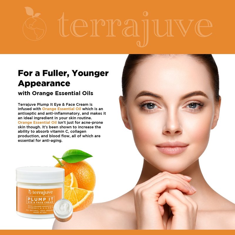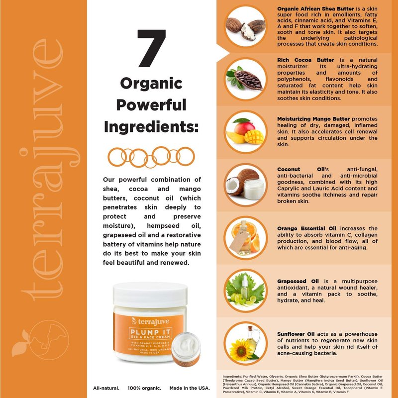 For a Fuller, Younger Appearance with Orange Essential Oils Terrajuve Plump It Eye & Face Cream is infused with Orange Essential Oil and makes it an ideal ingredient in your skin routine. Orange Essential Oil isn't just for acne-prone skin though. It's been shown to increase the ability to absorb vitamin C, collagen production, and blood flow. Our 7 Organic Natural powerful combination of shea, cocoa and mango butters, coconut oil which penetrates skin deeply to protect and preserve moisture, hempseed oil, grapeseed oil and a restorative battery of vitamins help nature do its best to make your skin feel beautiful and renewed. Organic African Shea Butter is a skin super food rich in emollients, fatty acids, cinnamic acid, and Vitamins E, A and F that work together to maintain healthy skin. Moisturizing Mango Butter promotes healing of dry, damaged, inflamed skin. It also accelerates cell renewal and supports circulation under the skin. Coconut Oil combined with its high Caprylic and Lauric Acid content and vitamins soothe itchiness and repair broken skin. Rich Cocoa Butter is a natural treatment for dermatitis. Its ultra-hydrating properties and amounts of polyphenols, flavonoids and saturated fat content not only soothes the skin, but also helps prevent any flare-ups. Grapeseed Oil is a multipurpose natural wound healer, and a vitamin pack to soothe, hydrate, and heal. Sunflower Oil acts as a powerhouse of nutrients to regenerate new skin cells and help your skin rid itself of acne.