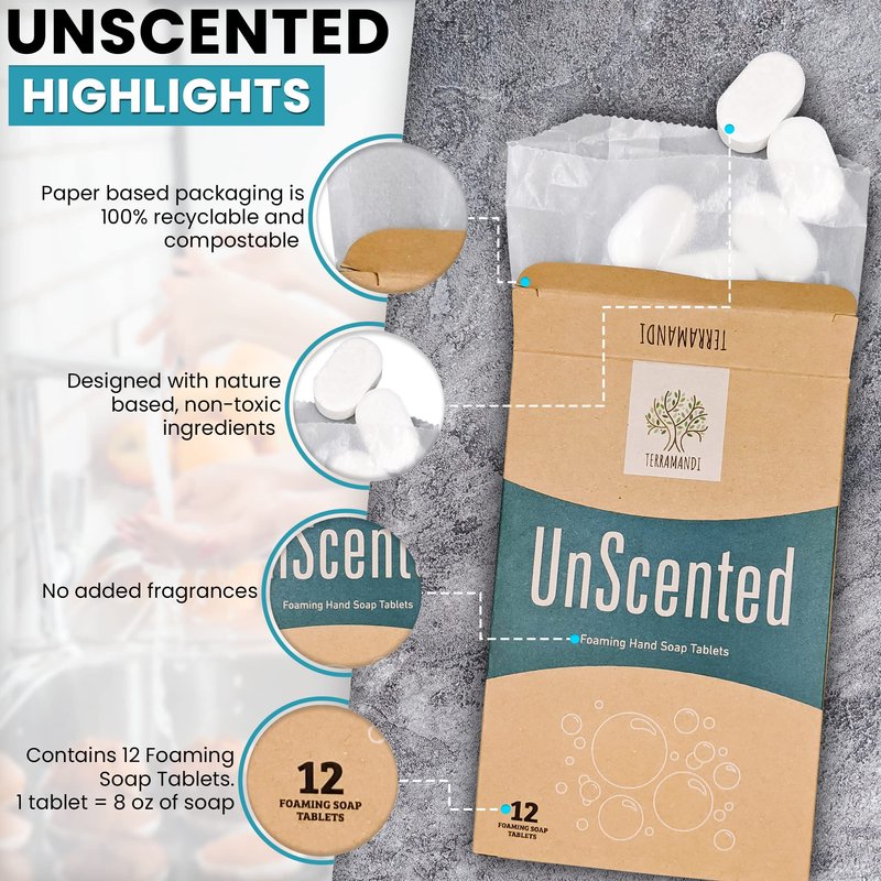 Terramandi Foaming Hand Soap Tablets 12 count Refill - Makes 96 fl oz of foaming hand soap (12x 8 fl oz bottles of soap) (UnScented)