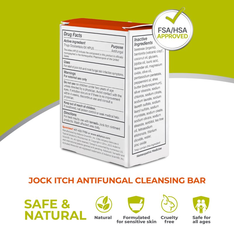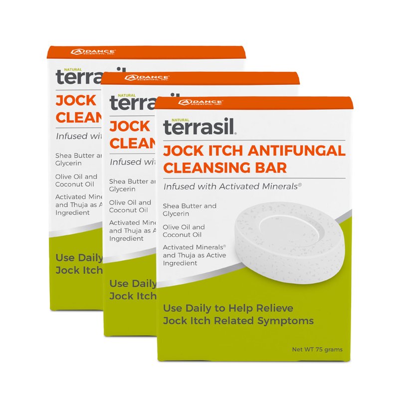 Terrasil Jock Itch Soap is made with high quality natural skin conditioning ingredients like olive oil and shea butter, features a powerful fungus fighting ingredient and is infused with our patented Activated Minerals. Use daily for relieving jock itch (tinea cruris) related symptoms and for complete relief use with the Terrasil Jock Itch Treatment Max ointment.
