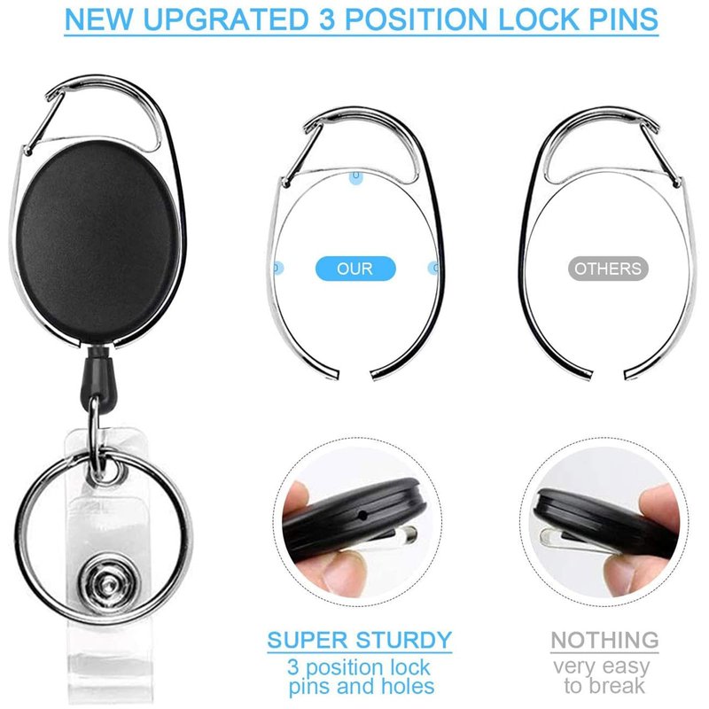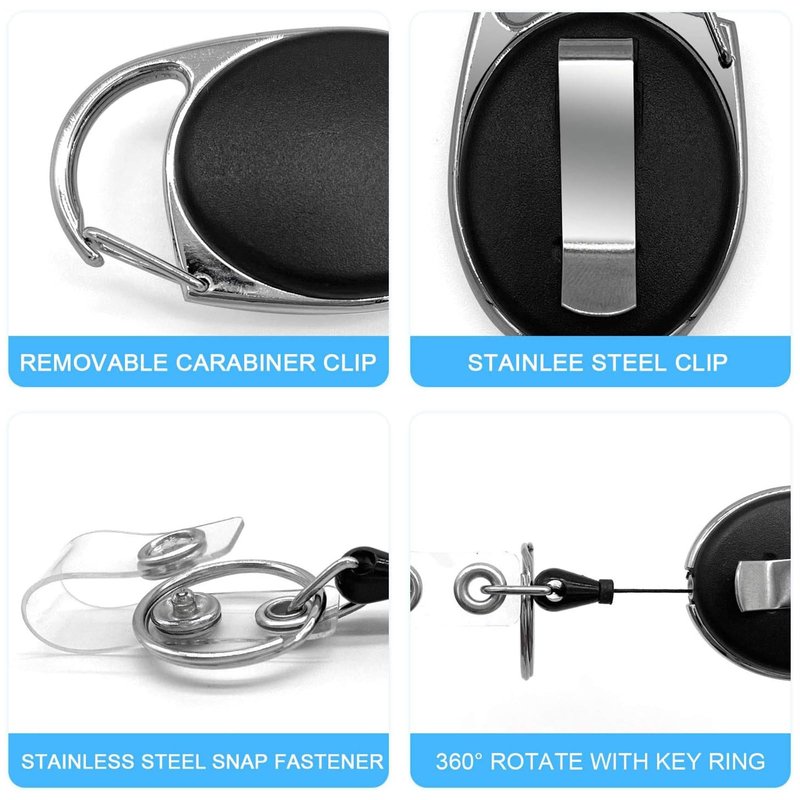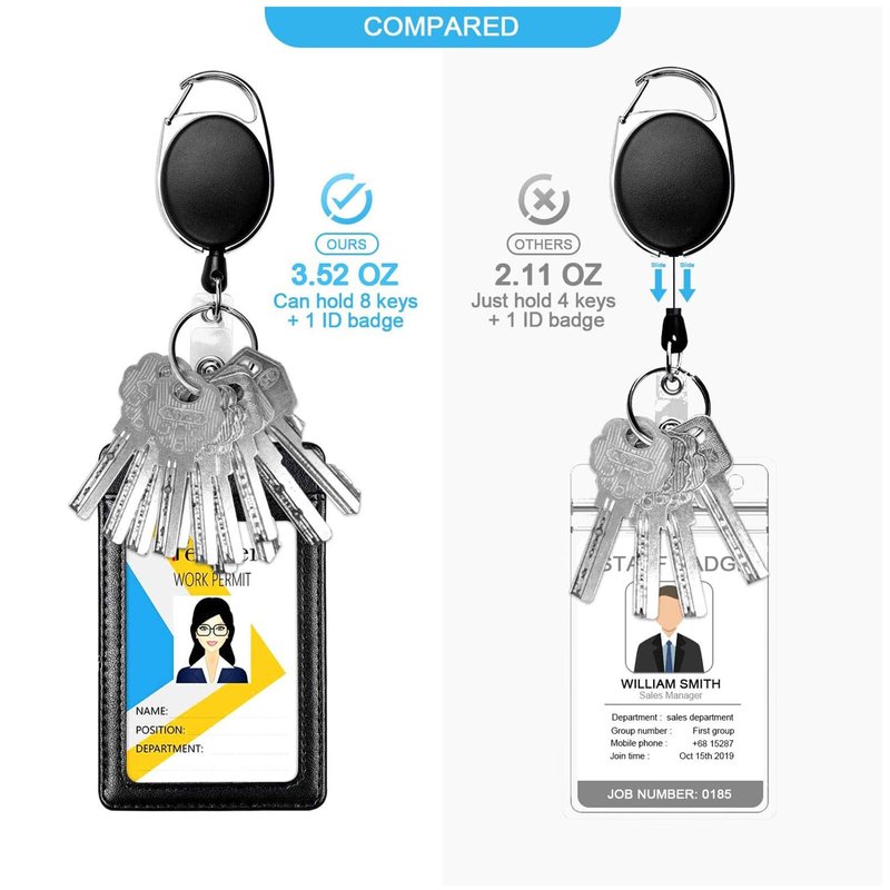 - 【Upgraded Heavy Duty Badge Reel】- We added 3 snaps between the badge reel and the metal carabiner clip to make it stronger, effectively reducing the possibility of breaking. Our max loading weight is 3.5oz or 7 keys compared to 2oz or 4 keys of other items on the market