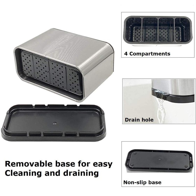 - MULTI-PURPOSE: Using for Utensil Holder, Toothbrush Holder, Tool Organizer, etc. 4 divided compartments to separate and organize utensils, Pencil, Toothbrush and Toothpaste in daily life. Tighter bottom mesh prevent them fall. Keep countertops clear, no more mess around the sink.