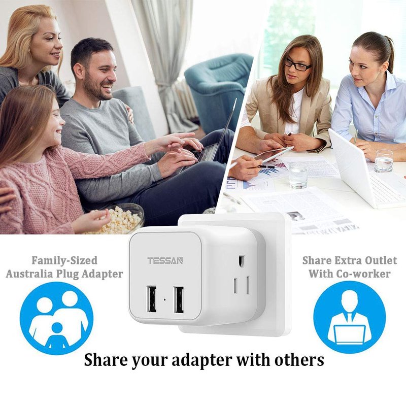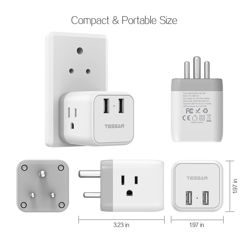 TESSAN US to India travel plug adapter has a Type D plug with 3 standard USA AC outlets and 2 USB ports, It turns one India socket (Type D) into three standard 3-prong and 2-prong American outlets PLUS two USB charging ports. You can plug in five electric devices at the same time without blocking each other. No need to take extra wall outlet extender power strip. A compact and sleek friendly design. A portable India power adapter when you travel to Type D countries from American. Compatible in countries such as Bangladesh, India, Kuwait, Madeira, Maldives, Namibia, Nepal, Pakistan, Qatar, Sri Lanka, Yemen