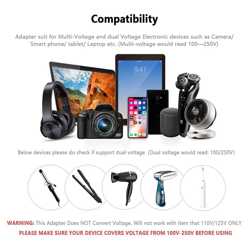 - NOT a Voltage Converter: This adapter works with wide-voltage electronics products(100V-250V), not work on devices that 110V/125V voltage ONLY. And can NOT convert voltage from 220V to 110V or vice versa.