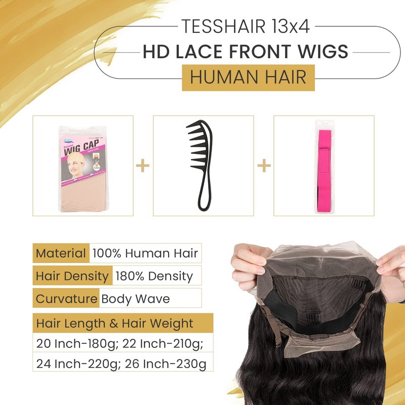 TESSHAIR 13x4 Body Wave Lace Front Wigs Human Hair Pre Plucked for Black Women, 180% Density Glueless HD Transparent Lace Front Wigs Human Hair Wig with Baby Hair (24 Inch)