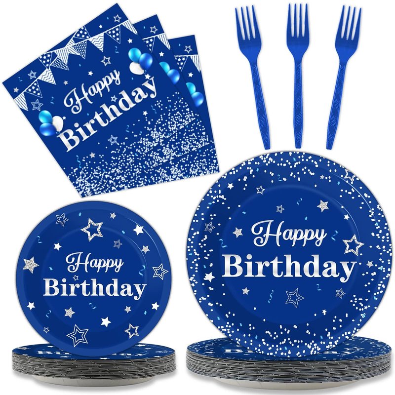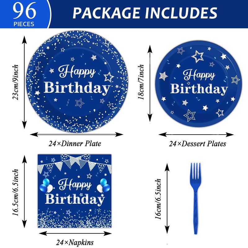- What's in the package: You'll receive 24 9" blue and silver happy birthday party paper plates, 24 7" blue and silver happy birthday party paper plates, 24 6.5" blue and silver happy birthday party napkin replacers, and 24 plastic blue forks, each set serves 24 people guests