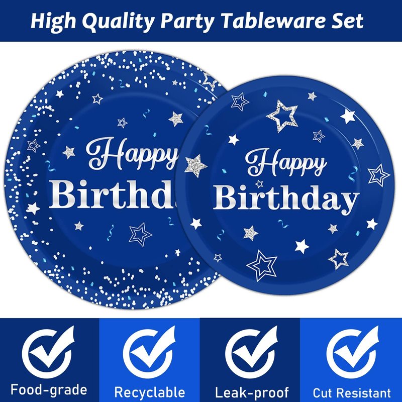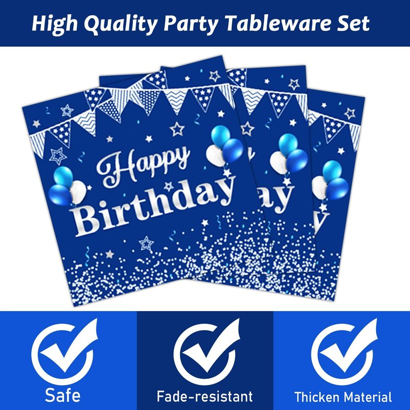 - Convenient: These easy blue and silver happy birthday party kits are the perfect addition to your birthday party decorations. These paper plates and napkins are disposable after use, saving you time in cleaning up. Perfect for happy birthday parties.