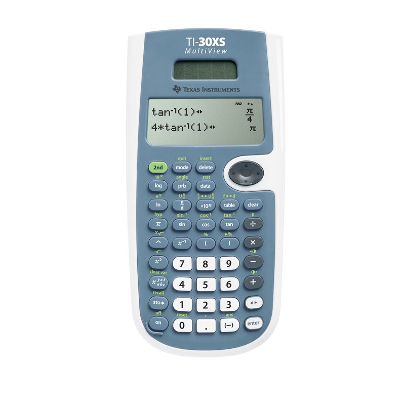 TI-30XS MultiView calculator with four-line, 16-character display allows you to enter more than one calculation, compare results and explore patterns, all on the same screen. Enter and view calculations in common Math Notation via the MATHPRINT mode, including symbolic pi, stacked fractions, exponents and exact square roots. Use Toggle Key to view fractions and decimals in alternate forms. Easy-to-read and navigate pull-down menus are similar to those on a graphing calculator. All mode settings are located in one central place, the mode screen. View scientific notation with the proper superscripted exponents and see output in scientific notation. Use table feature to explore (x,y) table of values for a given function, automatically or by entering specific x values. Scientific calculator displays multiple calculations and answers as you would write it. Scroll, review and edit current or previous entries. Runs on solar and battery power. Includes a protective cover.