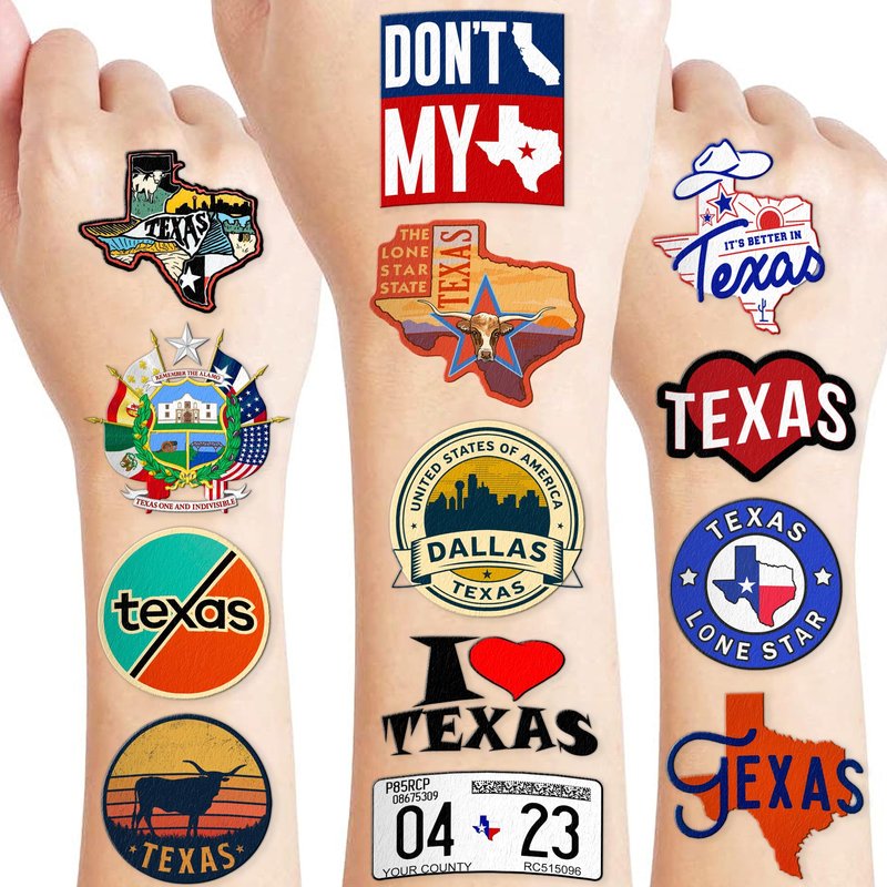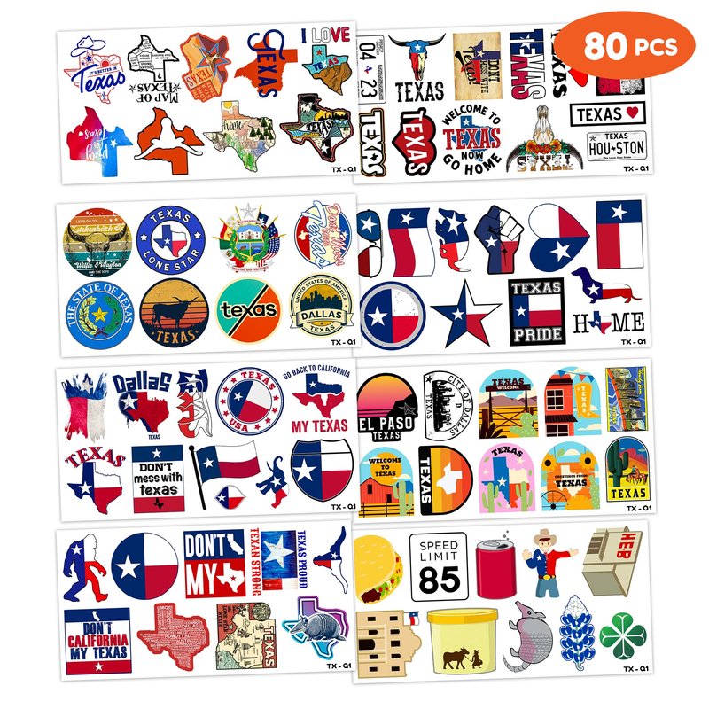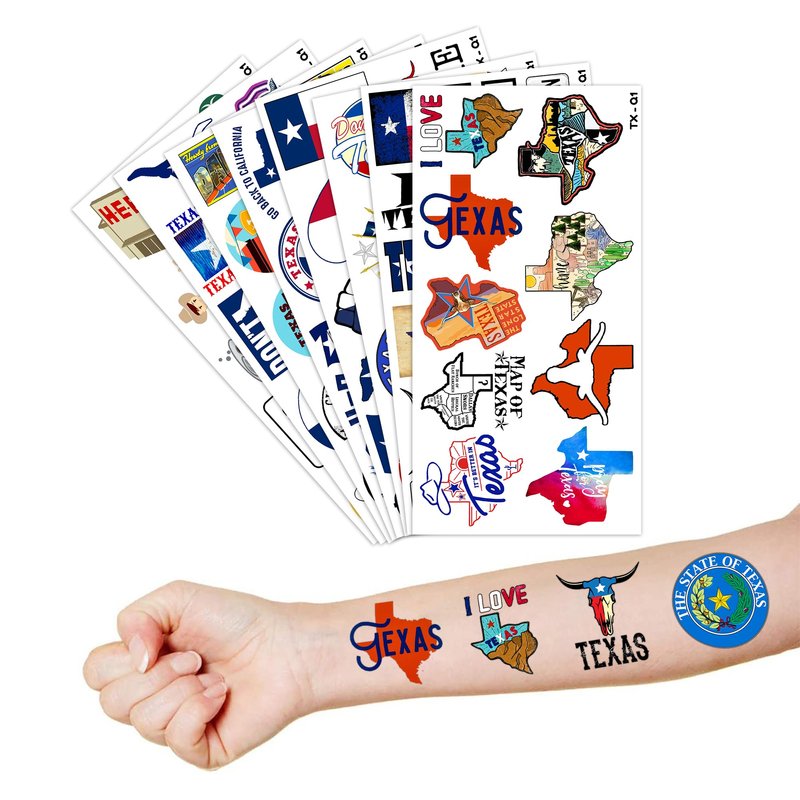 - Cute Texas State Map Flag Pride Retro USA Party Supplies: 8 sheets Texas State Map Flag Pride Retro USA cartoon themed temporary tattoos stickers, features an assortment of cute themed characters, each sheet measures 6.1 x 3.1 inch , all kinds of designs and colors will bring more fun to your party, one size fit all adult and kids.