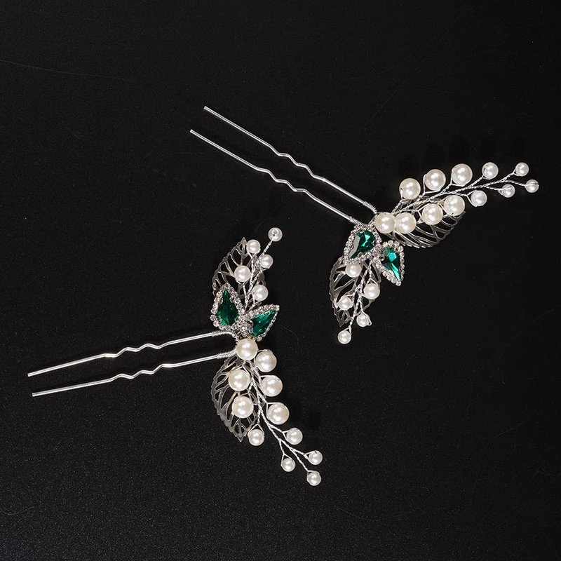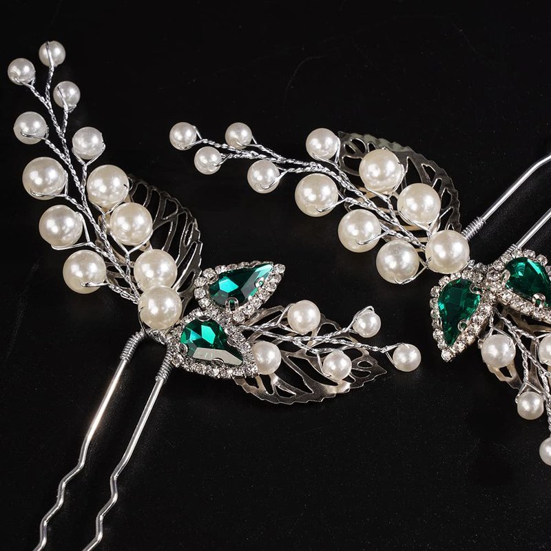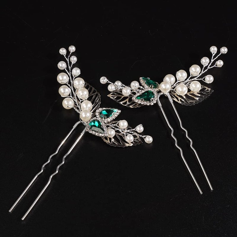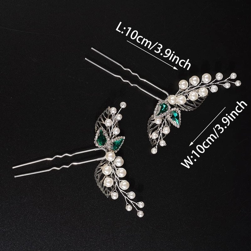 Teyglen 2pcs Pearl Bride Wedding Hair Pins Silver Leaf Crystal Hair Pins Clips Bridal Green Teardrop Rhinestone Hair Piece Wedding Hair Accessories for Women Girls