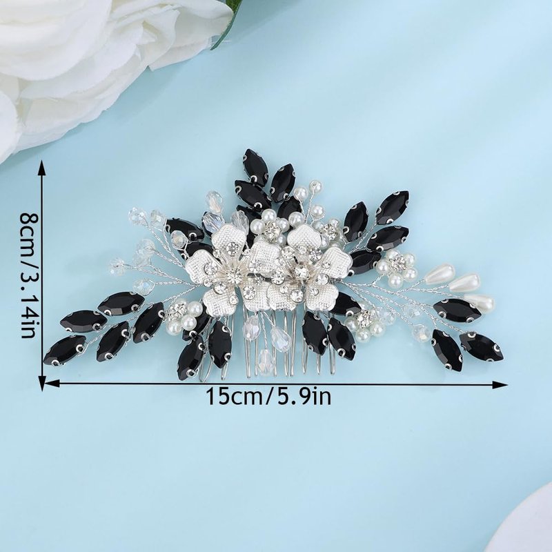 - Dainty Black Crystal Pearl Flower Hair Comb with Rhinestone.