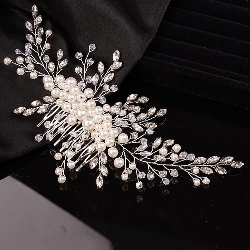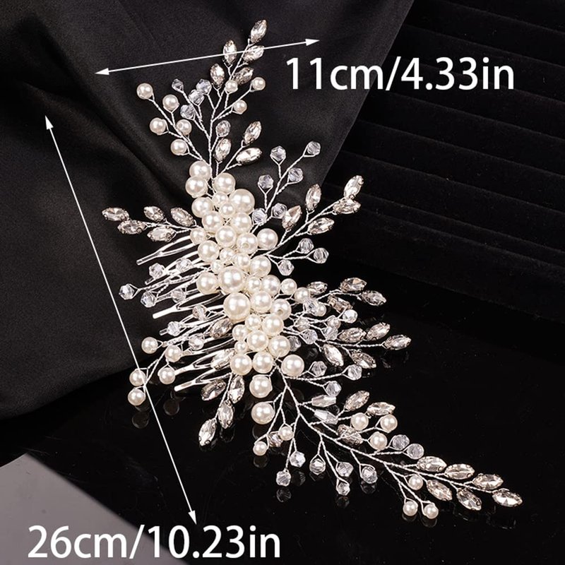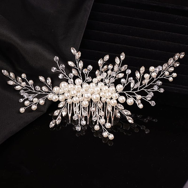 Teyglen Bridal Crystal Hair Comb Crystal Pearl Hair Pieces Bride Wedding Side Hair Comb Handmade Rhinestone Pearl Beads Headpieces Luxurious Hair Accessories for Brides Women Girls (Silver)