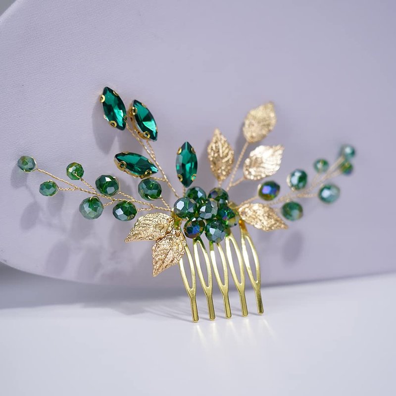 Teyglen Bridal Wedding Gold Hair Combs Green Flower Rhinestones Crystal Side Hair Comb Vintage Leaf Crystal Bride Hair Accessories for Women Girls