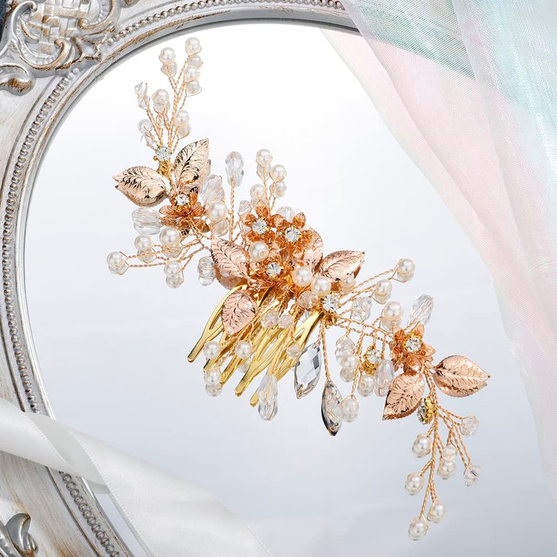 Teyglen Bridal Wedding Hair Comb Gold Flower Leaf Rhinestone Crystal Side Hair Comb Bride Hair Pieces Hair Accessories for Women Girls (Gold)
