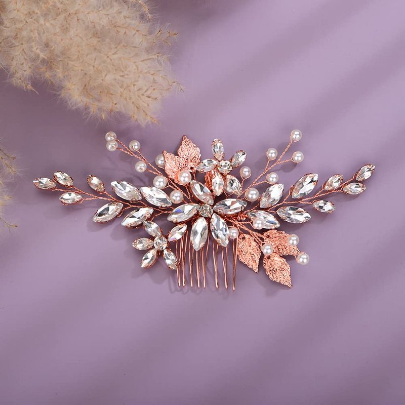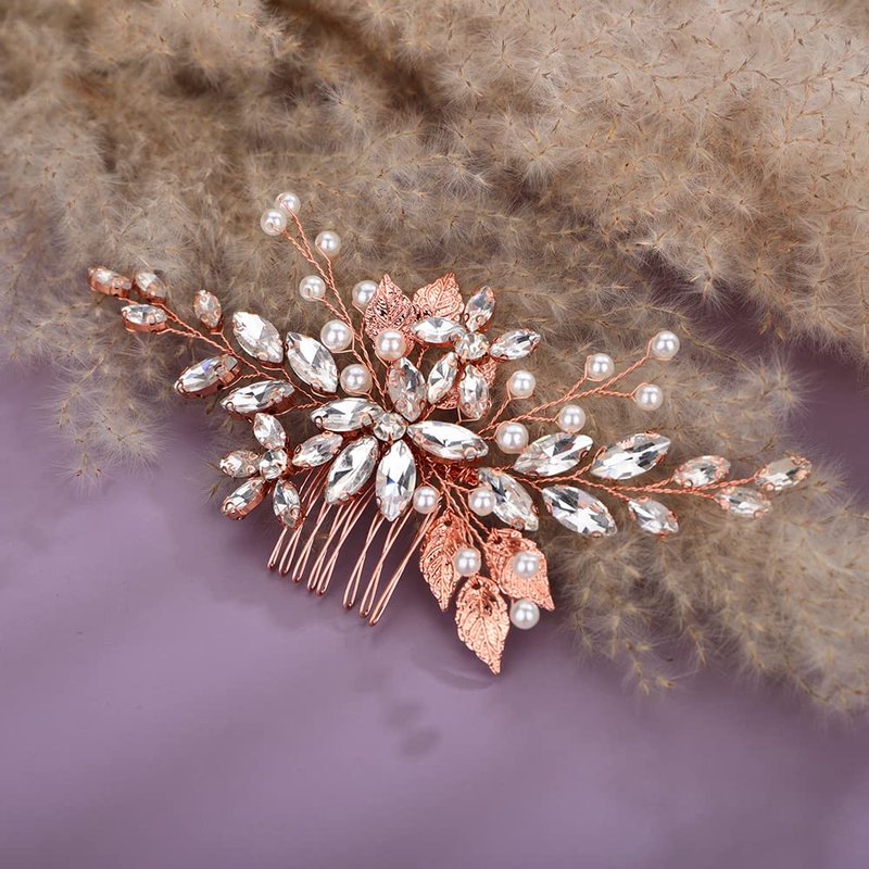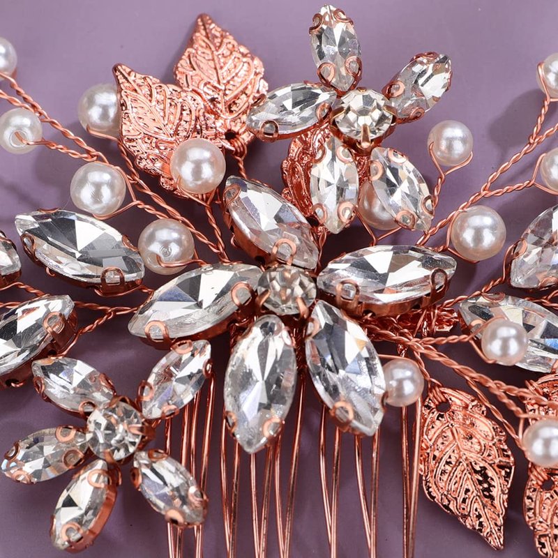 Teyglen Bridal Wedding Hair Combs Flower Rhinestones Crystal Side Hair Comb Gold Silver Leaf Crystal Bride Hair Accessories for Women Bride Girls (Rose Gold)