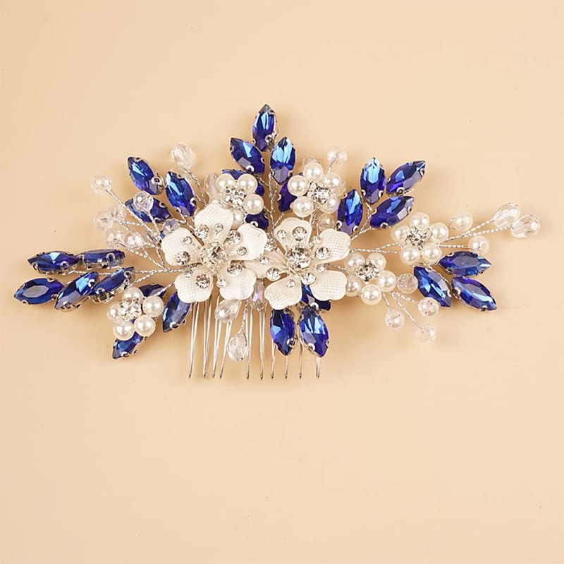 Teyglen Crystal Bride Wedding Hair Comb Vintage Blue Flower Rhinestones Side Comb Shiny Hair Pieces Headpieces with Pearl Bridal Hair Accessories for Women Bride Girl(Blue)
