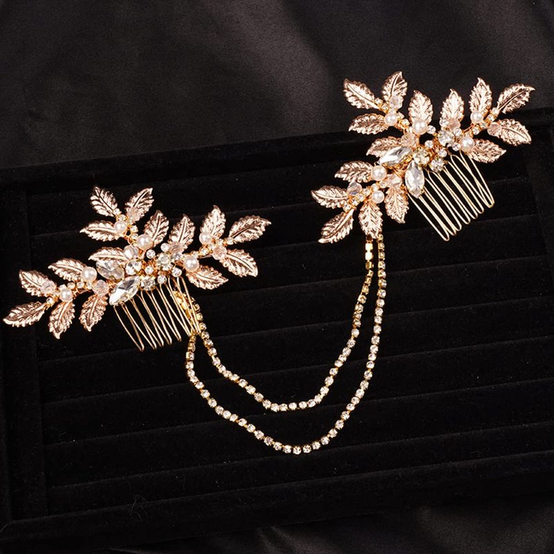 Teyglen Dainty Bridal Gold Leaf Hair Comb Headband Handmade Crystals Pearl Hair Pieces for Bride Rhinestone Headpieces Hair Accessories Pearl Side Hair Combs for Women Girls