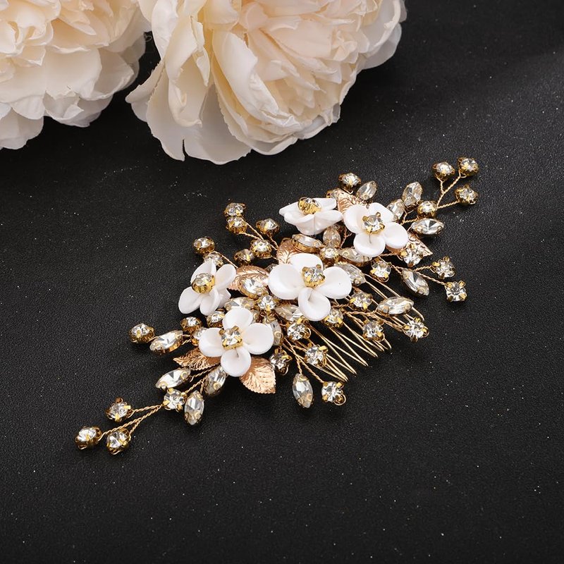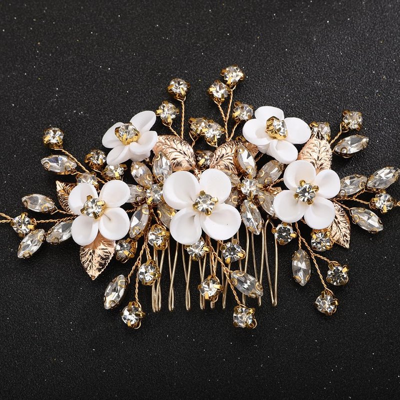 Teyglen Flower Leaf Wedding Hair Comb Gold Silver Leaf Rhinestone Hair Pieces Bridal Crystal Hair Comb Handmade Flower Headpieces Hair Accessories for Women Bride Girls (Gold)