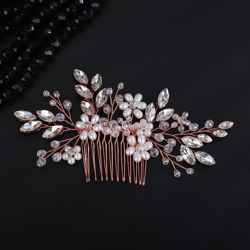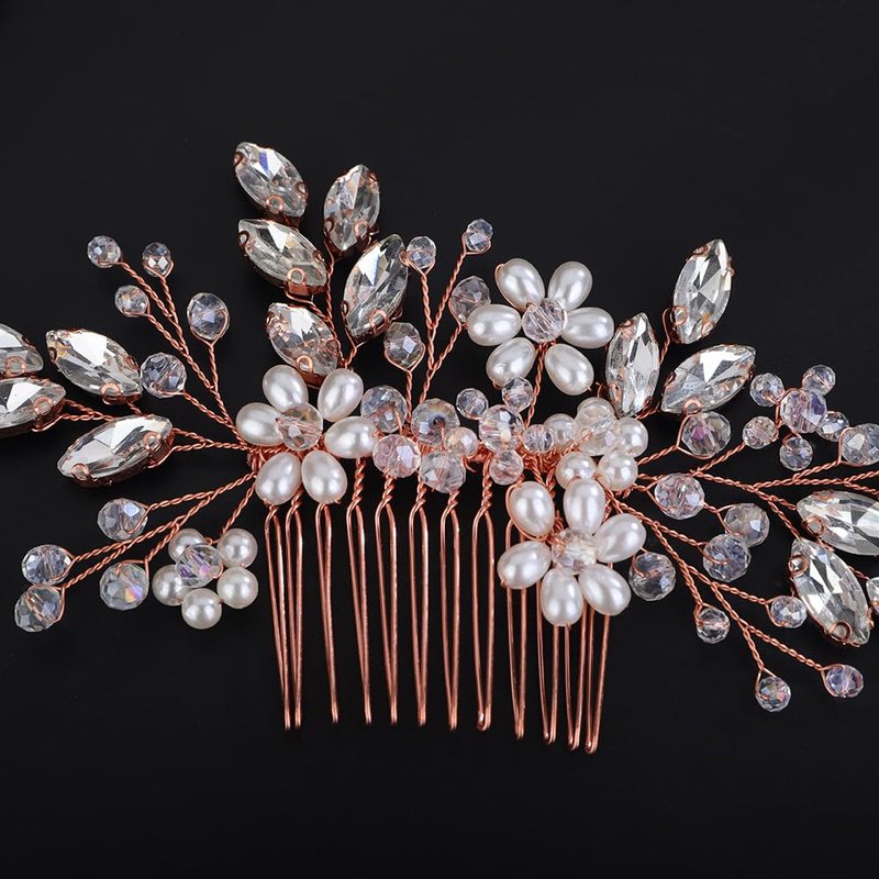 - Delicate rose gold crystal rhinestone hair comb with pearl flower for women party prom wedding and evening,exquisite and unique design,will add more charm for your outfit.