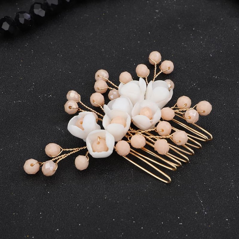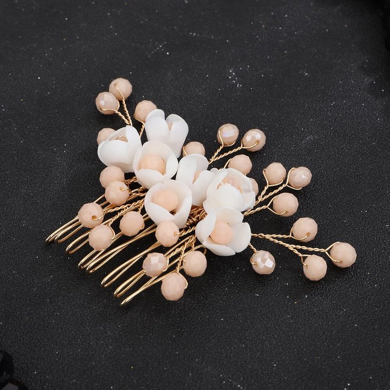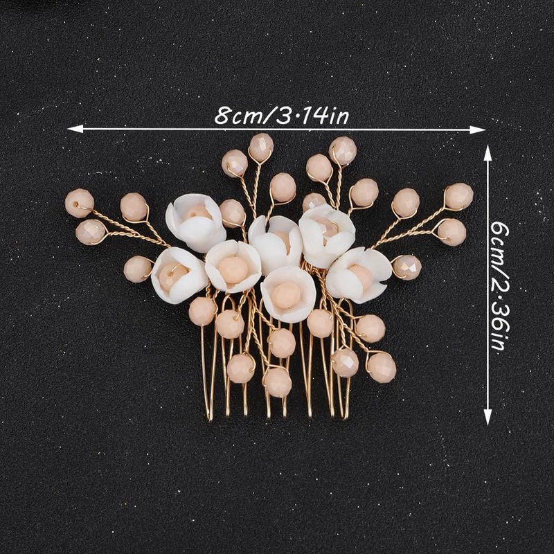 Teyglen Flower Wedding Bride Hair Comb Floral White Flower Headpiece Bridal Champagne Crystal Beads Hair Side Comb Hair Accessories for Women Flower Girl Wedding Prom