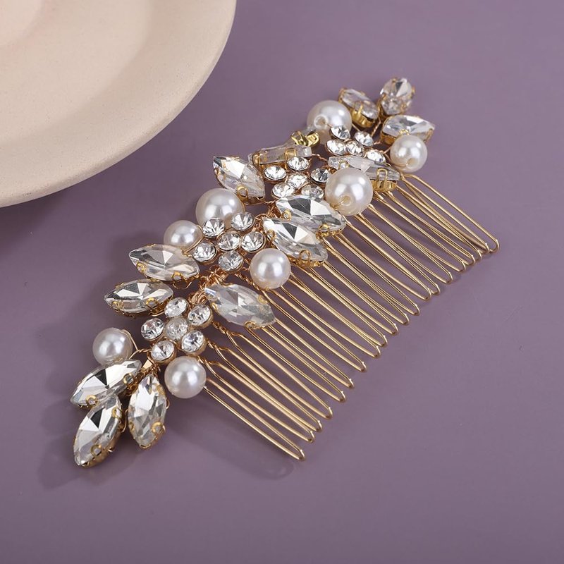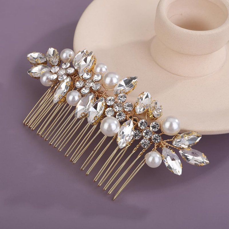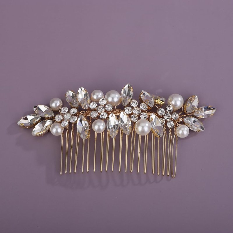 - Sparkly gold flower rhinestone hair comb with pearl for women party prom wedding and evening,exquisite and unique design,will add more charm for your outfit.