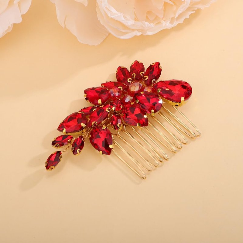 Teyglen Rhinestone Wedding Hair Comb Red Crystal Bridal Hair Piece Crystal Bride Wedding Hair Comb Sparkly Red Rhinestone Headpiece Hair Accessories for Women Girls (Red)