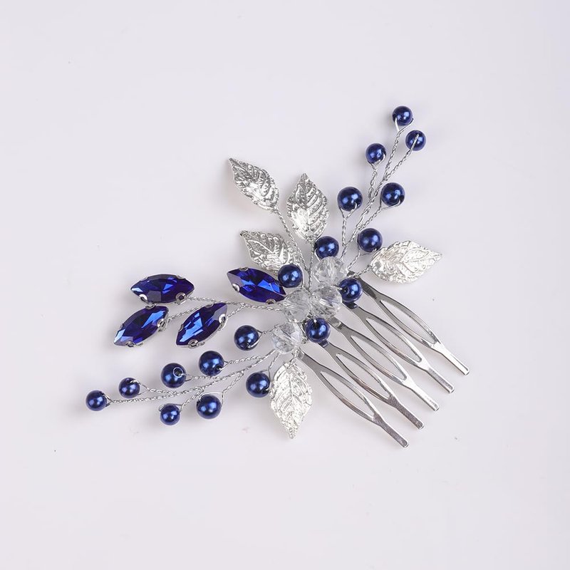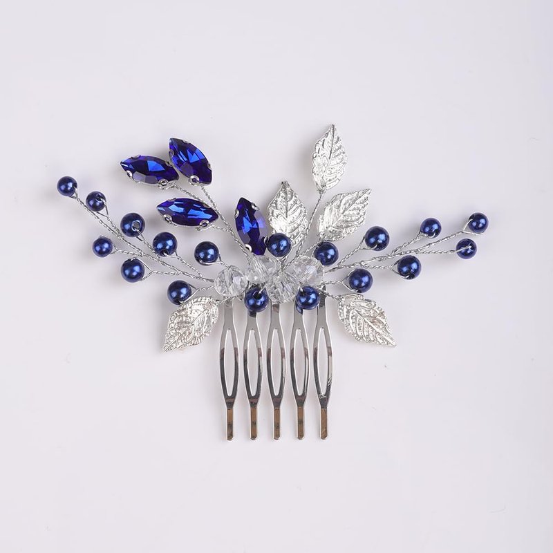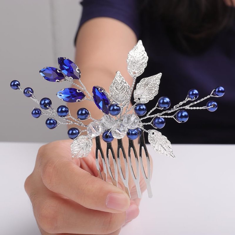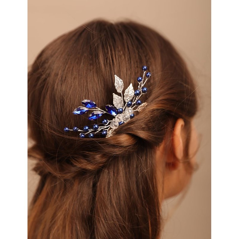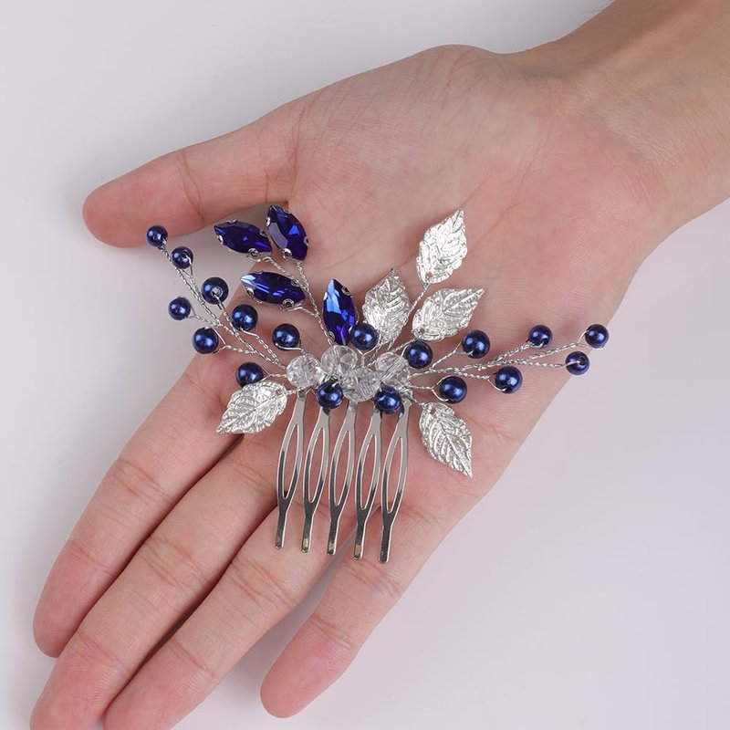 - Dainty silver leaf blue rhinestone pearl beads hair comb for women party prom wedding and evening,exquisite and unique design,will add more charm for your outfit.