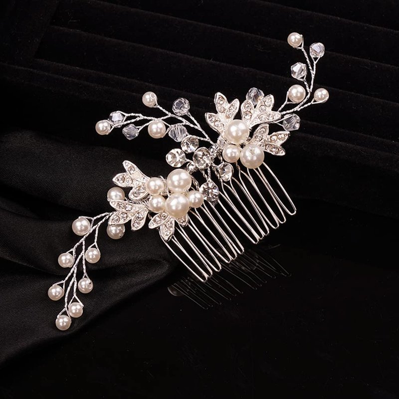 Teyglen Silver Leaf Wedding Hair Comb Bridal Crystal Pearl Hair Pieces Bridal Hair Side Comb for Bride Rhinestone Headpieces Hair Accessories for Women Girls (Silver)