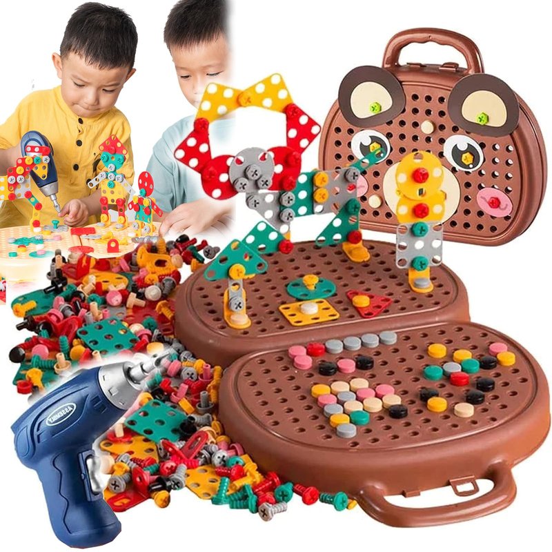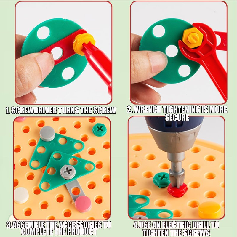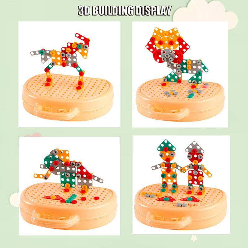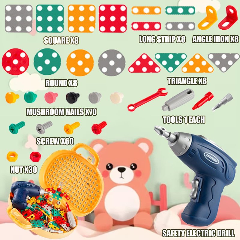 - 【203-Piece Building Toy Set】The kids drill set includes colorful parts (large nuts, bolts, etc.), 1 electric drill, 1 wrench, 1 screwdriver, a page of instructions with various patterns and a portable design storage box to keep everything together. The box can also be used as a drilling board. Convenient to carry with you!