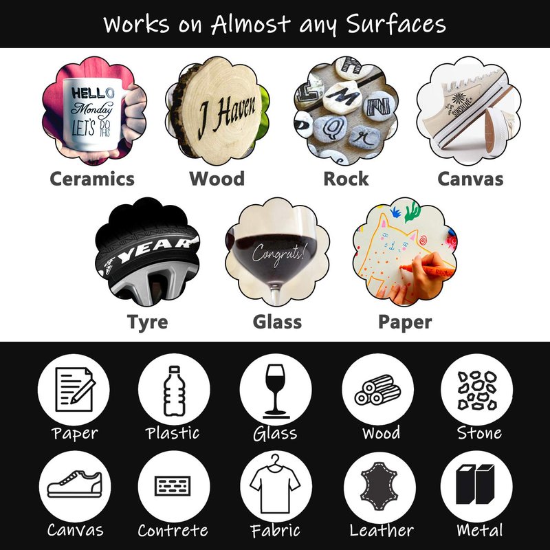 - 【WORKS ON ALMOST ANY SURFACES】The paint pens works on almost any surfaces such as rock, canvas, wood, metal, glass, ceramic, plastic, tire, etc. They are the best tool for creativities!