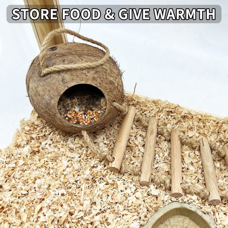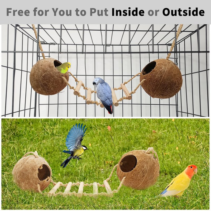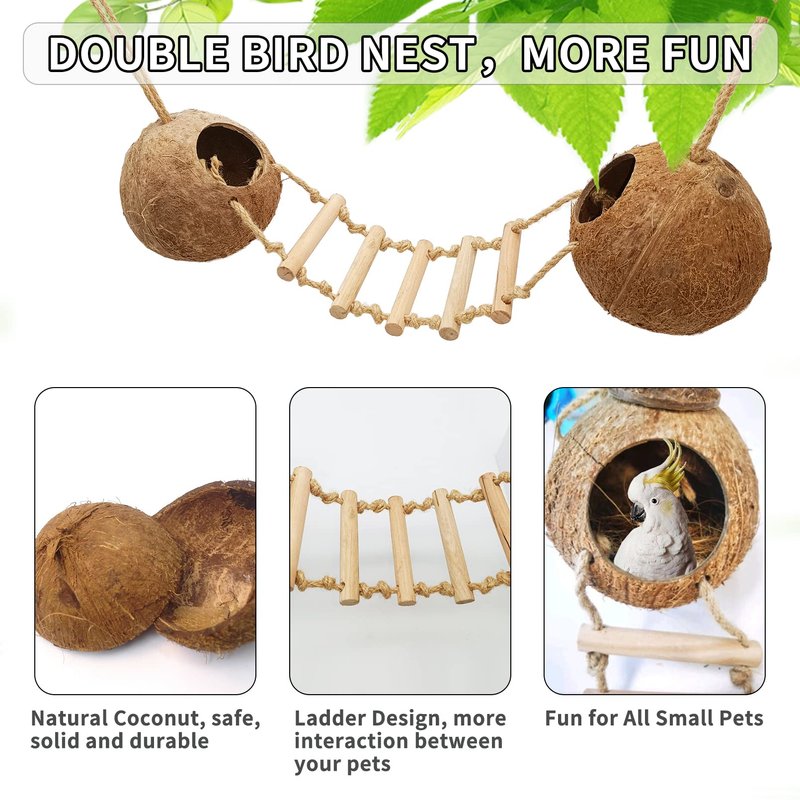 - ✔DOUBLE BIRD NEST DESIGN: The product has two bird nests, on the basis of the original entertainment ladder, increased the interaction of pets on both sides, the material is natural coconut shell, five-section ladder, high-quality hemp rope hardware, strong and durable, suitable for parrots and other small pets.